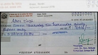 School Principal Cheque: हिमाचल प्रदेशातील सिरमौर जिल्ह्यातील रोनहाट शाळेतील ड्रॉईंग शिक्षक अत्तर सिंह यांना चेकवरील इंग्रजी स्पेलिंगच्या भयंकर चुका केल्याबद्दल निलंबित करण्यात आले आहे. या चुकांमुळे शिक्षण विभागाची देशभरात मोठी फजिती झाली असून, मुख्याध्यापकांवरही कारवाईची शक्यता आहे.