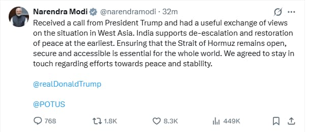 आजच्या फोन कॉलचा सर्वात महत्त्वाचा मुद्दा Strait of Hormuz हा होता. या सामुद्रधुनीतून वाहतूक सुरळीत सुरू राहणे किती आवश्यक आहे, यावर दोन्ही देशांनी भर दिला. जगातील सुमारे एक-तृतीयांश तेल या मार्गाने वाहून नेले जाते आणि सध्या इराणने येथे अडथळा निर्माण करून जागतिक पुरवठ्यावर परिणाम घडवला आहे.