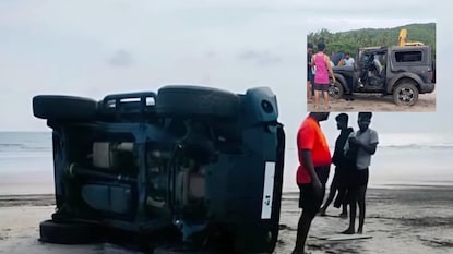 समुद्रकिनाऱ्यावर 'थार'चा थरार! सुसाट गाडी जागेवर पलटी, पर्यटकांच्या काळजाचा ठोका चुकला, घटना CCTVत कैद!