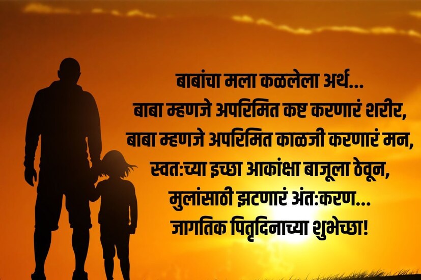 Happy Fathers Day Quotes In Marathi: 16 जून हा दिवस जगभरात फादर्स डे म्हणून साजरा केला जातो. प्रत्येकाच्या आयुष्यात वडिलांचं स्थान खूप महत्वाच असतं. तेव्हा फादर्स डे निमित्ताने आपल्या वडिलांना शुभेच्छा देण्यासाठी तुम्ही शुभेच्छा संदेश पाठवू शकता.