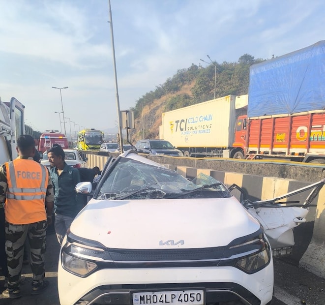 मुंबई पुणे-एक्स्प्रेस वेवर विचित्र अपघात, कंटेनरने 3 वाहनांना चिरडलं, Kia SUV चा चक्काचूर, घटनास्थळाचे PHOTOS