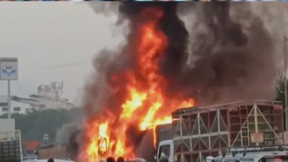 Pune News : नवले ब्रिजवर विचित्र अपघात, दोन आग लागलेल्या ट्रकमध्ये कार अडकली, अपघाताचा LIVE VIDEO