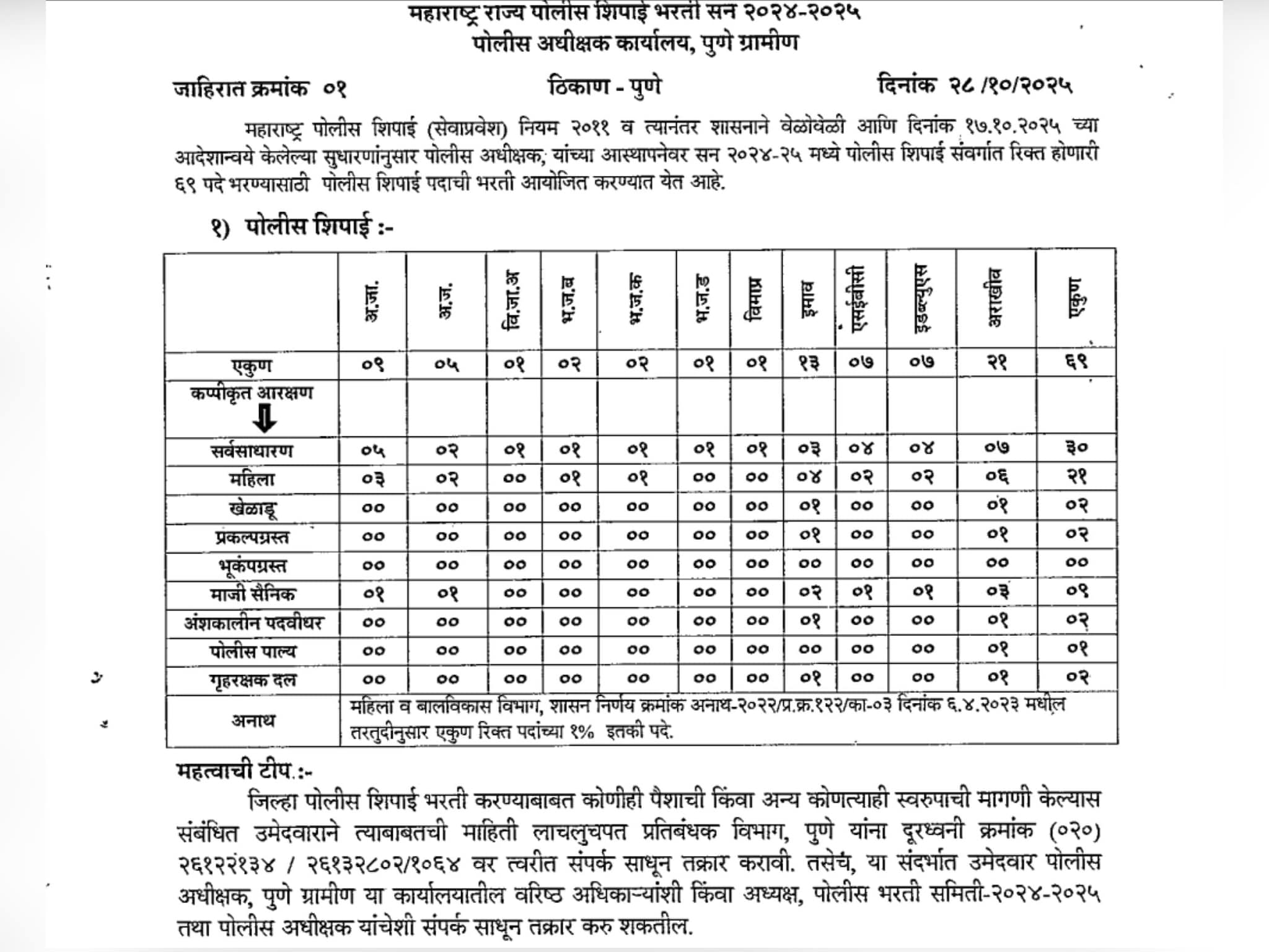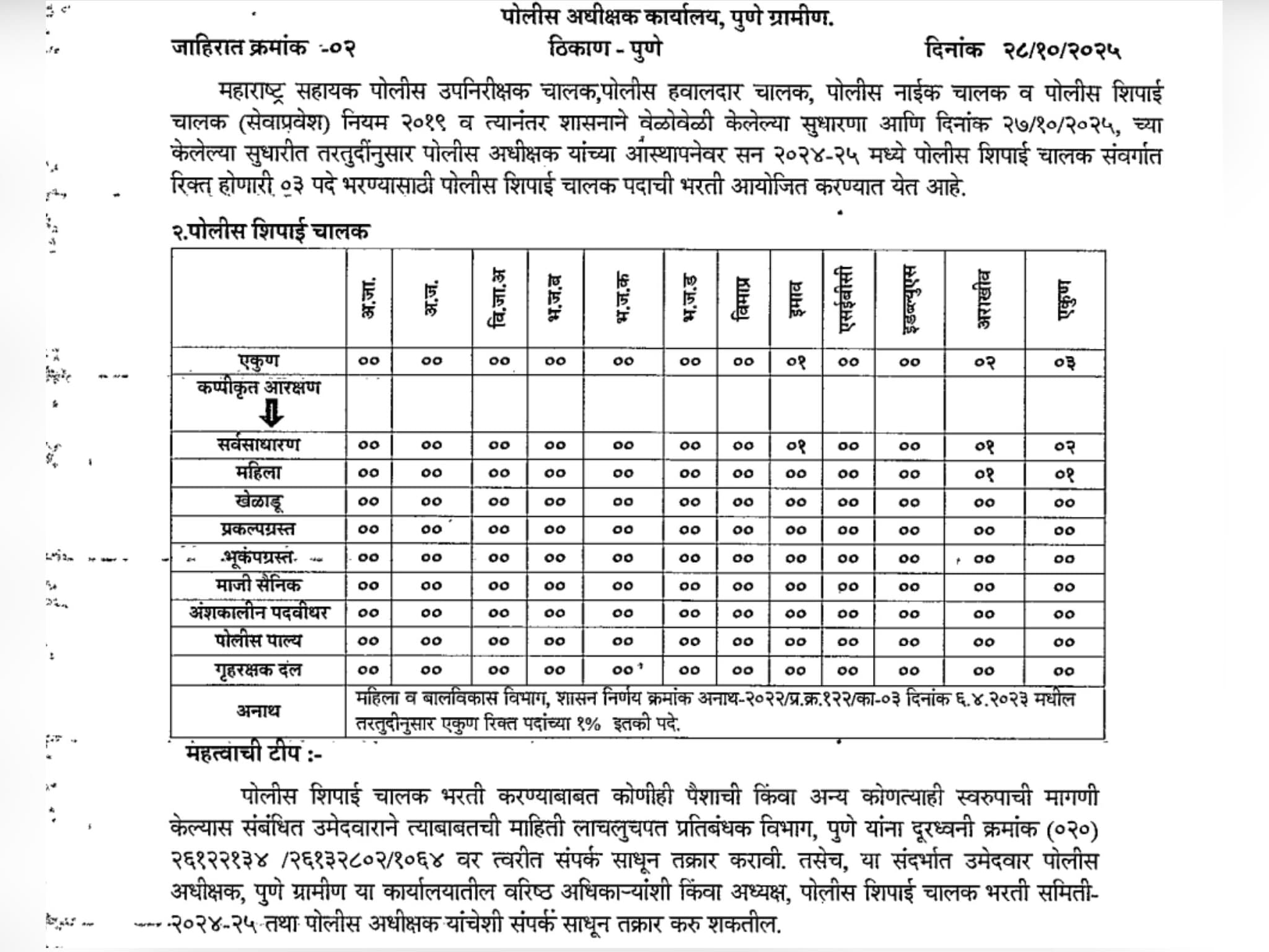 पोलीस शिपाई चालक पदासाठीच्या जाहिरातीनुसार, 3 जागांसाठी भरती केली जाईल. या जागांचेही आरक्षण प्रवर्गानुसार वर्गीकरण करण्यात आले आहे. इतर मागास वर्ग आणि अराखीव अशा दोन प्रवर्गामध्येच तीन जागांवर नोकरभरती केली जाणार आहे. या दोन्हीही प्रवर्गामध्ये सर्वसाधारण उमेदवारांसाठीच नोकरभरती केली जात आहे. इतरत्र उमेदवारांसाठी पोलीस शिपाई चालक पदासाठी नोकरभरती केली जाणार आहे. पुणे ग्रामीण पोलीस दलाने प्रसिद्ध केलेल्या जाहिरातीमध्ये जर भरती प्रक्रियेदरम्यान कोणीही पैशांची मागणी किंवा इतर कोणत्याही गोष्टीची मागणी जर केली, तर उमेदवारांनी तात्काळ दक्षता आणि लाचलुचपत प्रतिबंधक ब्युरो, पुणे येथे संपर्क साधावा.