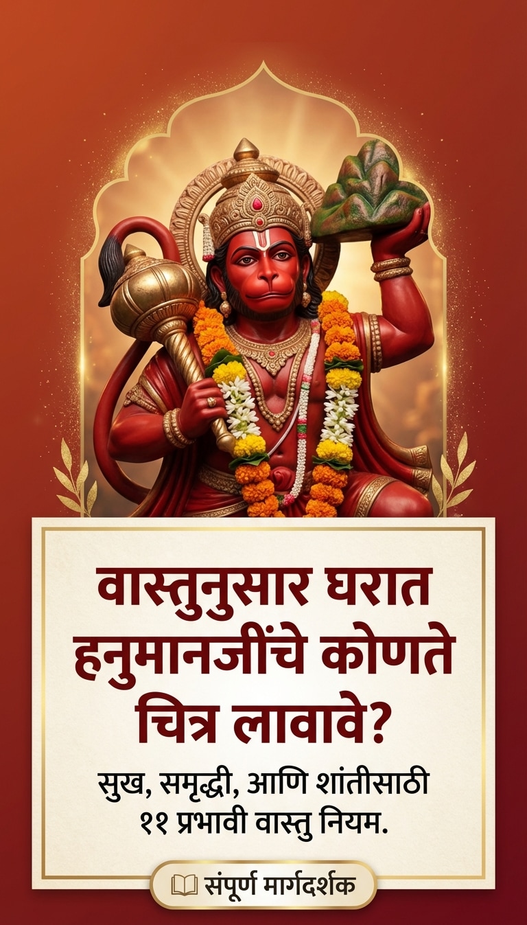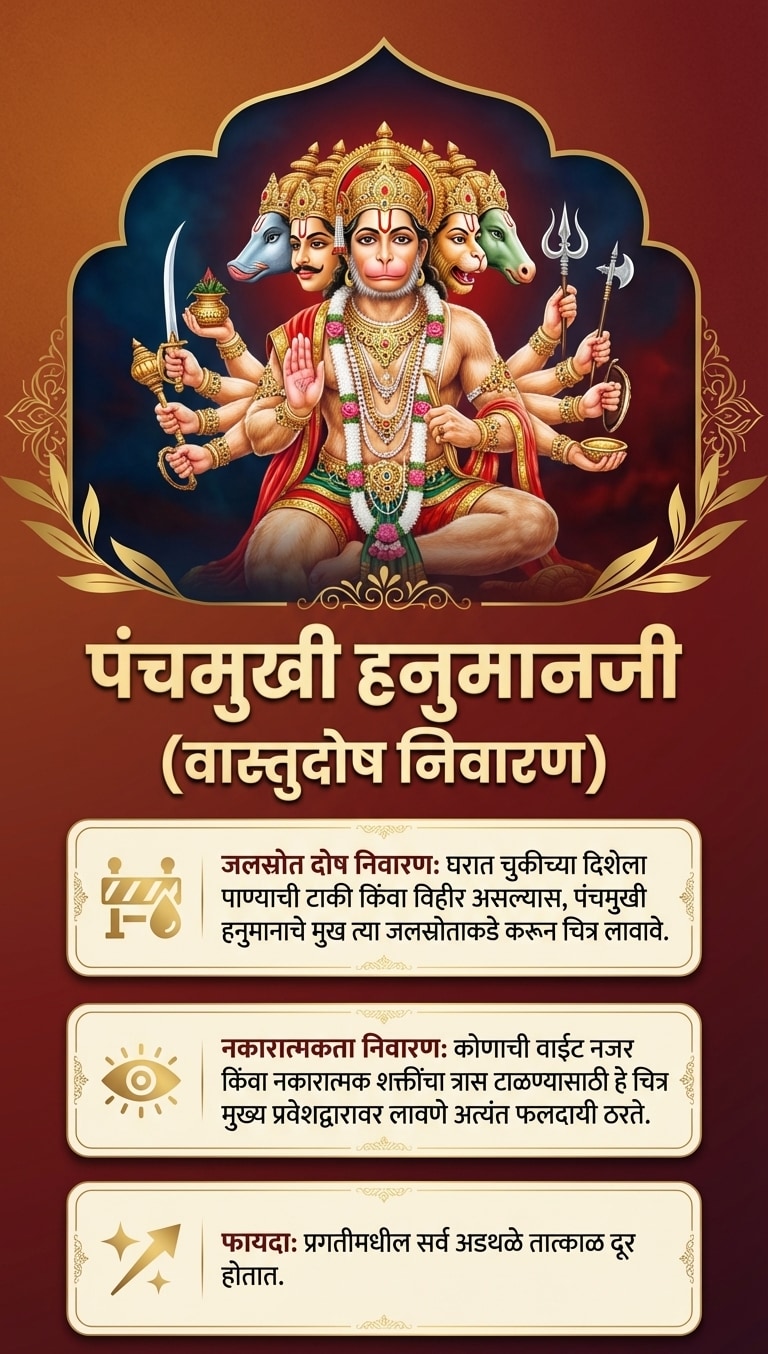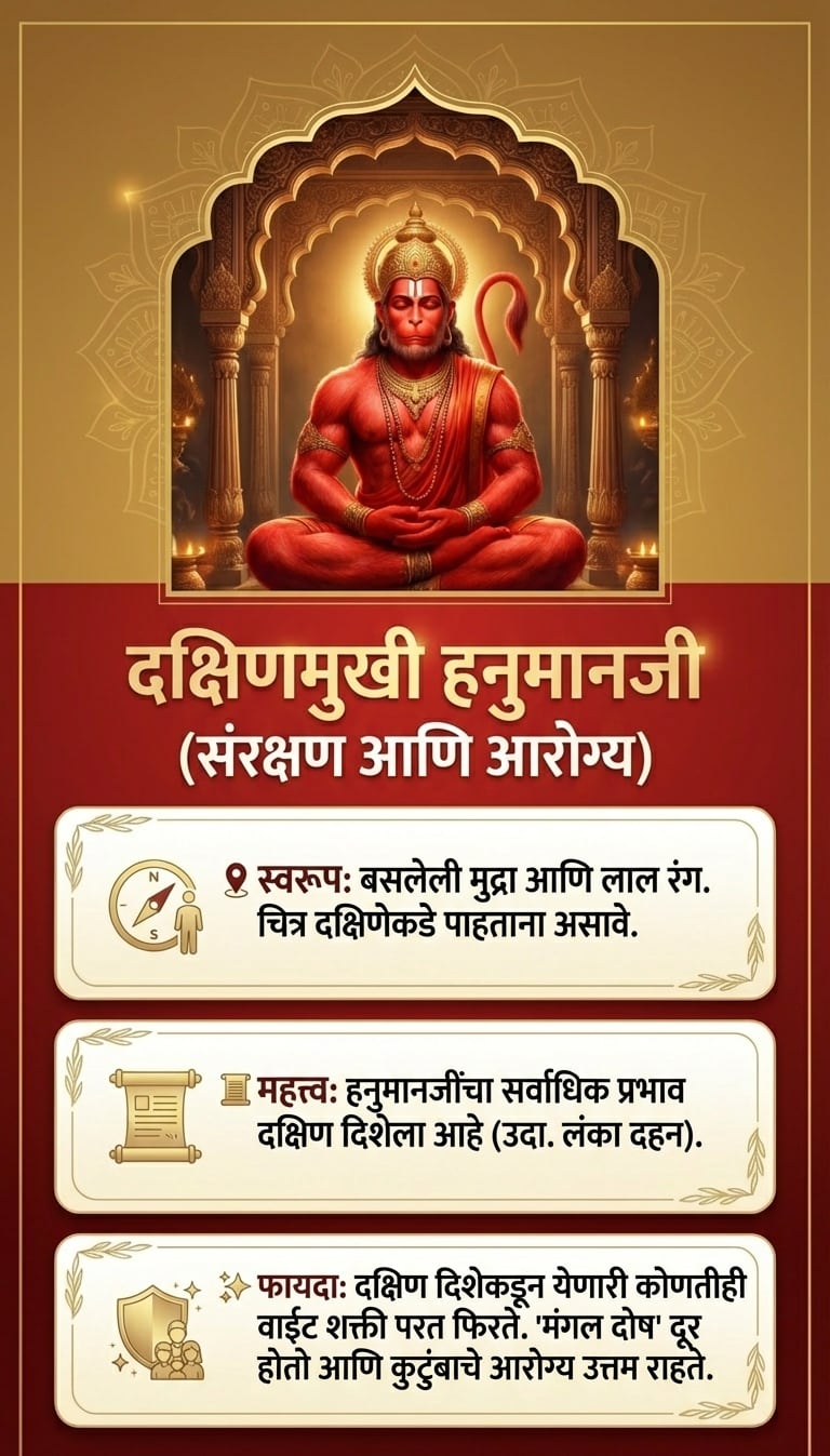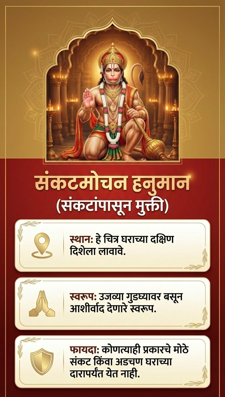 टीप: हनुमानजींची प्रतिमा लावताना ती नेहमी स्वच्छ जागी आणि पवित्र भावनेने लावावी. नियमितपणे त्यांची पूजा-आरती केल्यास अधिक शुभ परिणाम मिळतात.