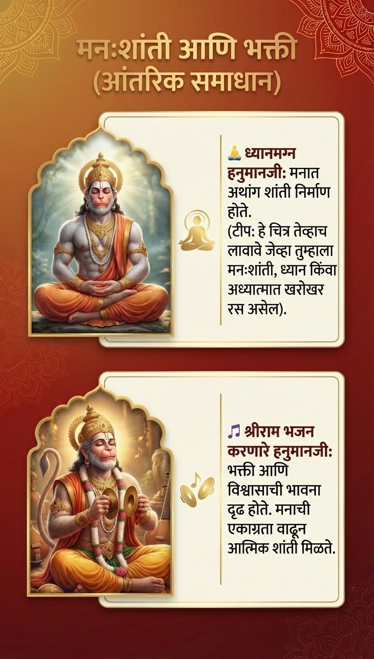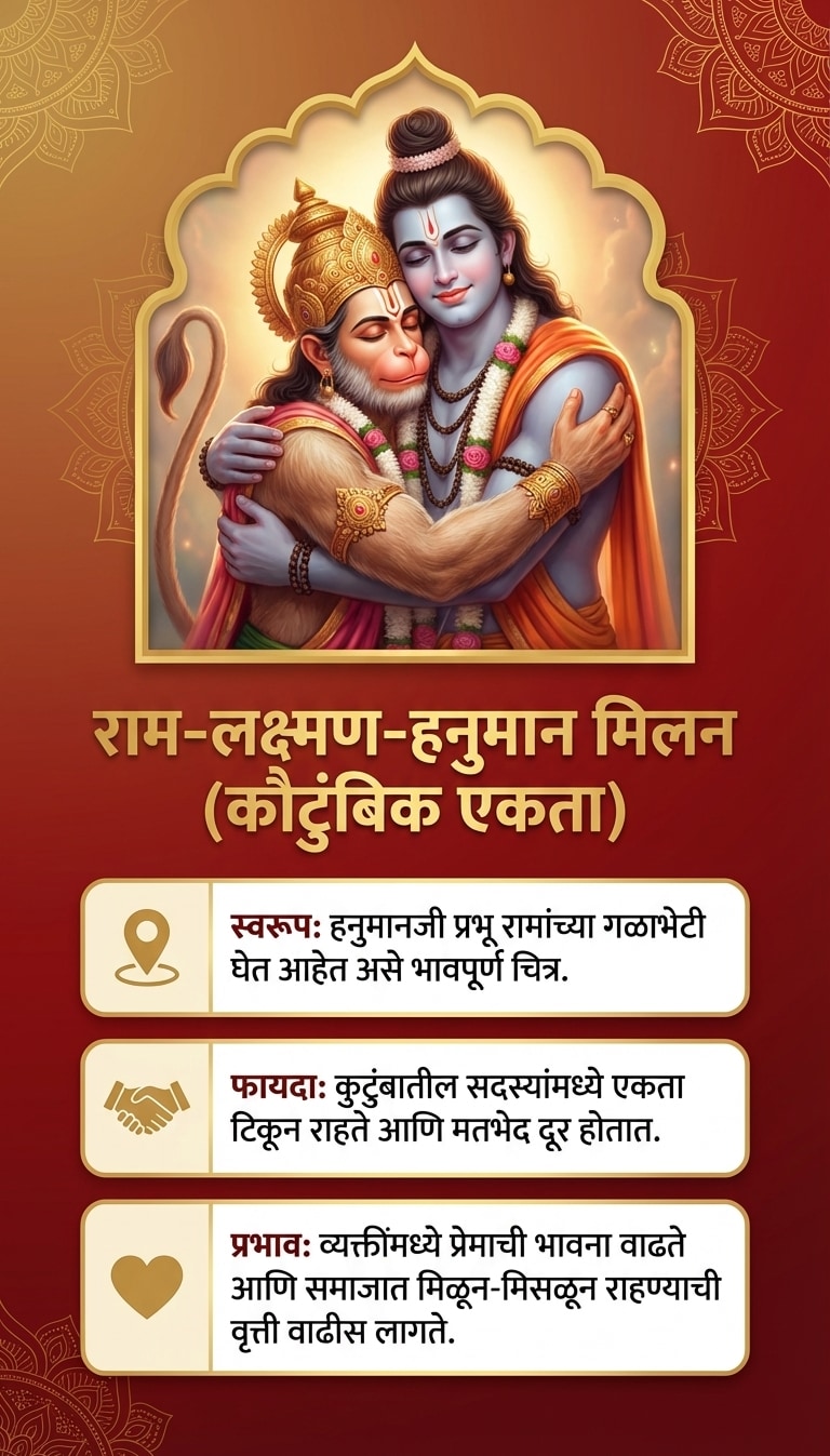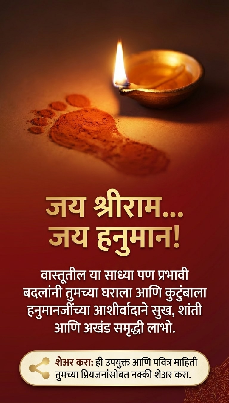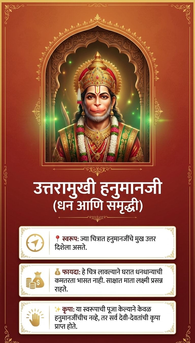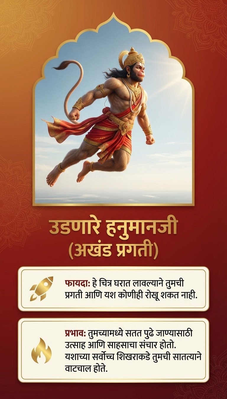 टीप: हनुमानजींची प्रतिमा लावताना ती नेहमी स्वच्छ जागी आणि पवित्र भावनेने लावावी. नियमितपणे त्यांची पूजा-आरती केल्यास अधिक शुभ परिणाम मिळतात.