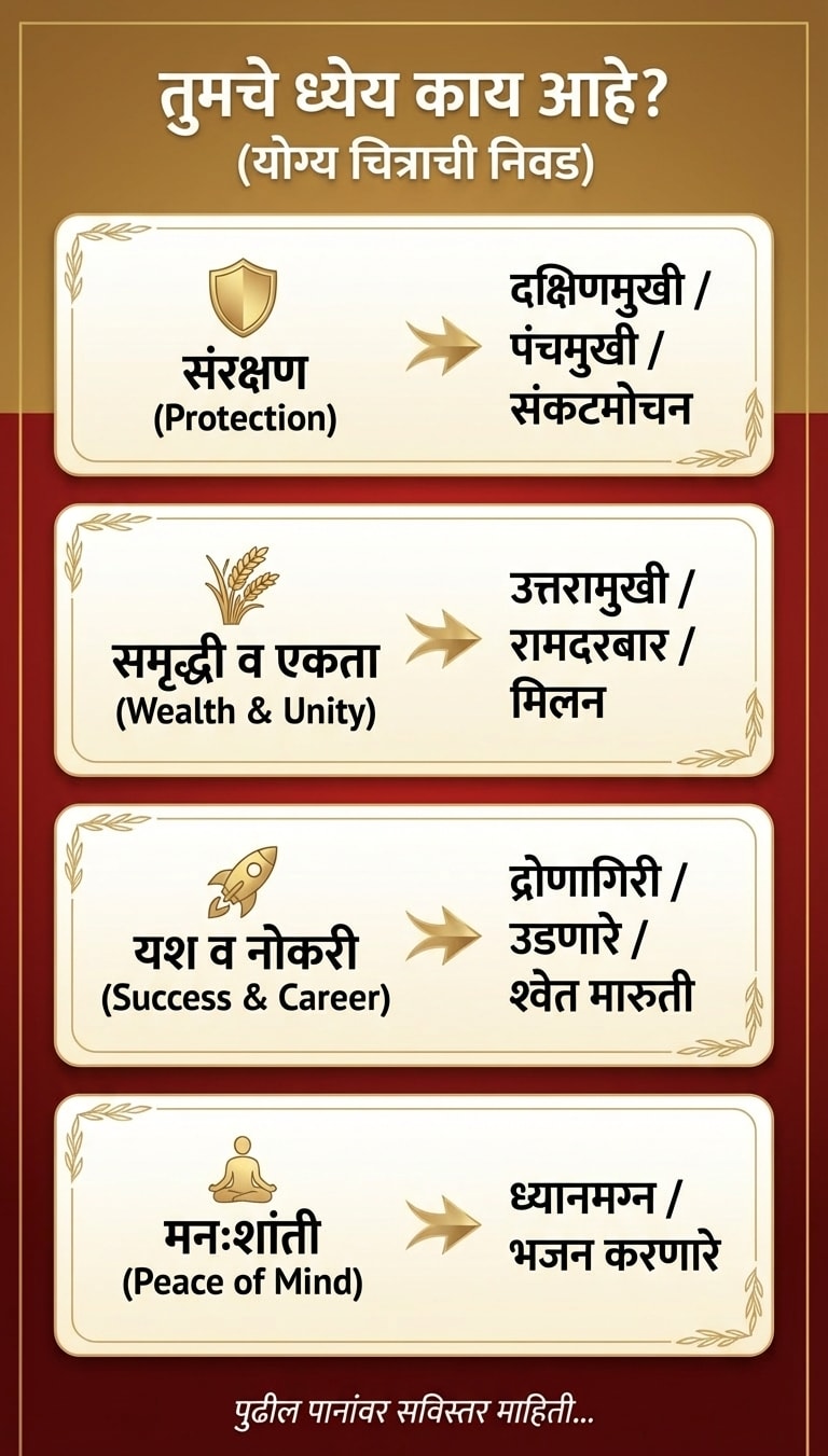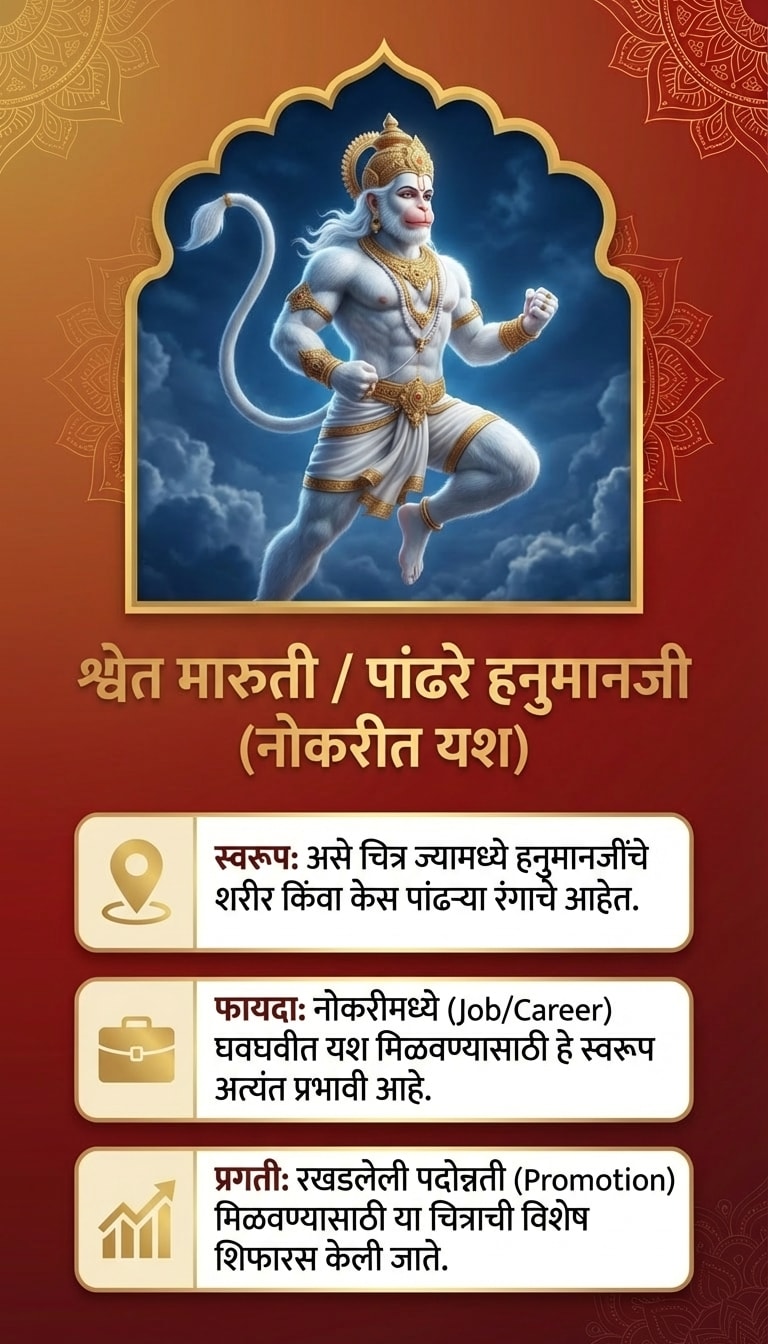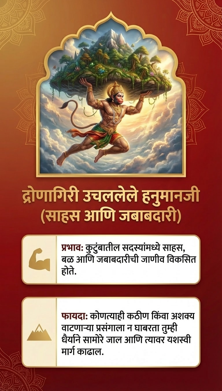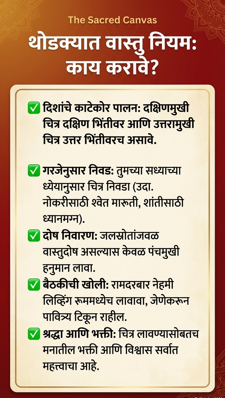 टीप: हनुमानजींची प्रतिमा लावताना ती नेहमी स्वच्छ जागी आणि पवित्र भावनेने लावावी. नियमितपणे त्यांची पूजा-आरती केल्यास अधिक शुभ परिणाम मिळतात.