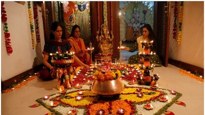 तुम्ही मातीचे दिवे, मेणबत्या आणि रांगोळी काढूनही घर सजवू शकता. देवघरात किंवा लिव्हिंग रुममध्ये टेबलावर किंवा स्टूलवर लाल सुती कापड अंथरा. त्यावर धान्य पसरवून धान्याच्या मध्यभागी 75 टक्के पाण्यानं भरलेला चांदीचा किंवा तांब्याचा कलश ठेवा. कलशात सुपारी, झेंडूचं फूल, एक नाणं आणि थोडे तांदूळ टाका. त्यानंतर कलशावर आंब्याची पाच पानं वर्तुळात स्वरूपात ठेवा. कलशाच्या उजव्या बाजूला दक्षिण-पश्चिम दिशेला श्री गणेशाची मूर्ती किंवा फोटो आणि मध्यभागी देवी लक्ष्मीची मूर्ती किंवा फोटो ठेवा.