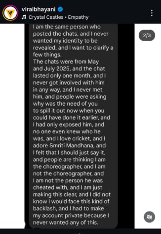 या सगळ्या वादाच्या मध्यभागी असलेली मेरी डिकोस्टा आता समोर आली आहे. पापाराझी विरल भयानी याने मेरी डिकोस्टासोबतच्या संभाषणाचे स्क्रीनशॉट शेअर केले आहेत, ज्यात मेरी डिकोस्टाने तिच्यावर होत असलेले आरोप फेटाळून लावले आहेत. 'पलाश मुच्छलवर फसवणूक केल्याचा आरोप होत आहे, पण ती व्यक्ती मी नाही. हे आरोप पूर्णपणे खोटे आहेत, तसंच माझ्या प्रतिष्ठेला हानी पोहोचवणारे आहेत. चुकीच्या गोष्टी पसरवण्याचं त्वरित थांबवा', असं मेरी डिकोस्टा म्हणाली आहे.
