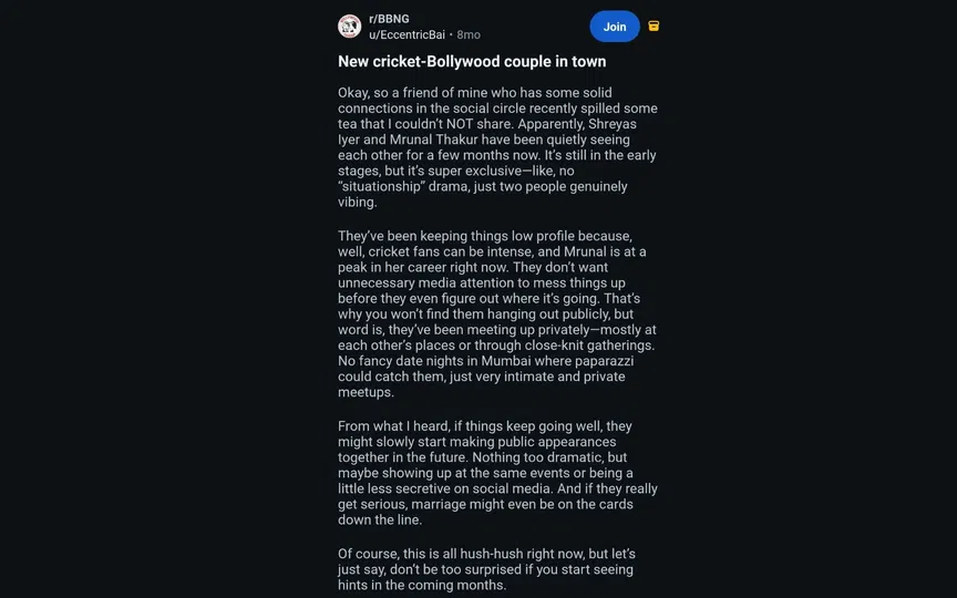 श्रेयस अय्यर आणि मृणाल ठाकूर हे दोघं त्यांच्या करिअरच्या सर्वोच्च टप्प्यावर आहेत, तसंच दोघांचा चाहता वर्गही मोठा आहे. या अफवा खऱ्या असतील तर मीडियाचं लक्ष त्यांच्या नात्यावर येऊन अनावश्यक दबाव येऊ नये, म्हणून हे दोघंही सार्वजनिक ठिकाणी एकत्र दिसणंही टाळत असल्याचं वृत्त आहे. सार्वजनिक ठिकाणी एकत्र दिसण्याऐवजी दोघेही जवळच्या मित्रांच्या किंवा एकमेकांच्या घरी भेटतात, असा दावाही रेडिटवर करण्यात आला आहे. श्रेयस अय्यर किंवा मृणाल ठाकूर या दोघांनीही या दाव्याची पुष्टी केलेली नाही. आतापर्यंत फक्त सोशल मीडियावरच दोघांच्या रिलेशनशीपचे दावे केले जात आहेत.