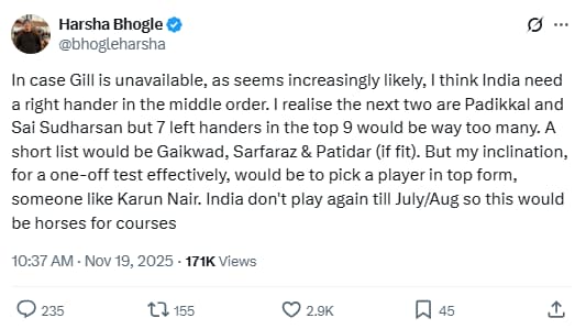 जर गुवाहाटी टेस्टसाठी शुभमन गिल उपलब्ध नसेल, तर मला वाटतं की भारताला मधल्या फळीत उजव्या हाताच्या गोलंदाजाची आवश्यकता आहे. मला माहित आहे की साई सुदर्शन आणि देवदत्त पेडिक्कल यांना यांना तयार केलं जात आहे, ते दोघं स्कॉडमध्ये आहेत. पण टॉप 9 बॅटरमध्ये मग 7 लेफ्ट हँडर खेळाडू असतील, असं म्हणत हर्षा भोगले यांनी टीम इंडियाची सर्वात मोठी चूक दाखवून दिली.