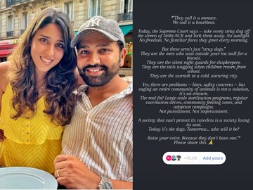 Ritika sajdeh Instagram Post : देशभरात भटक्या कुत्र्यांचा मुद्दा गाजत असताना सुप्रीम कोर्टाने दिल्ली शहर आणि राजधानी परिसरातील शहरांमध्ये असलेल्या भटक्या कुत्र्यांना निवारागृहात ठेवण्याचे आदेश दिले आहेत. यासाठी कोर्टाने प्रशासनाला 8 आठवड्यांची मुदत दिली आहे. कुत्र्यांच्या चाव्यांचे वाढते प्रमाण आणि रेबीज रुग्णांच्या वाढत्या संख्येला आळा घालण्यासाठी सुप्रीम कोर्टाने उचलल्याचं बोललं जातंय. अशातच आता याच मुद्द्यावरून अनेकांनी टीकात्मक भूमिका घेतली आहे. अशातच आता रोहित शर्माच्या पत्नीने म्हणजेच रितिका सजगदेहने देखील नाराजी व्यक्त केली.