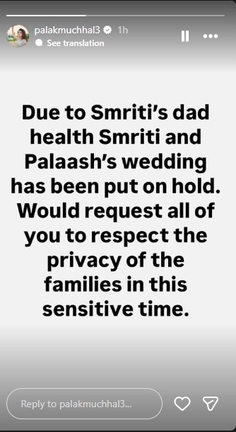 'स्मृतीच्या वडिलांची तब्येत बिघडल्यामुळे स्मृती आणि पलाशचं लग्न स्थगित करण्यात आलं आहे. या संवेदनशील वेळी, दोन्ही कुटुंबाच्या वैयक्तिक आयुष्याचा सन्मान करा', असं आवाहन पलक मुच्छलने केलं आहे.