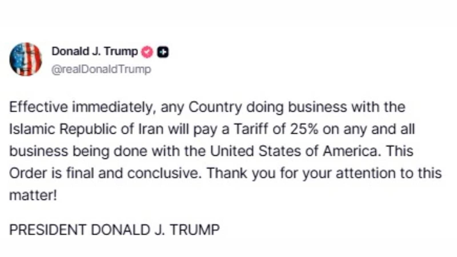 ट्रम्प यांनी पोस्टमध्ये सांगितलं की, हा टॅरिफ कर तत्काळ लागू केला जाईल. इस्लामिक रिपब्लिक ऑफ इराणसोबत व्यवसाय करणाऱ्या कोणत्याही देशाला अमेरिकेसोबतच्या सर्व व्यवसायांवर २५% कर भरावा लागेल आणि हा कर तत्काळ लागू होईल. हा आदेश अंतिम आहे, असंही ट्रम्प यांनी पोस्टमध्ये म्हटलं आहे.