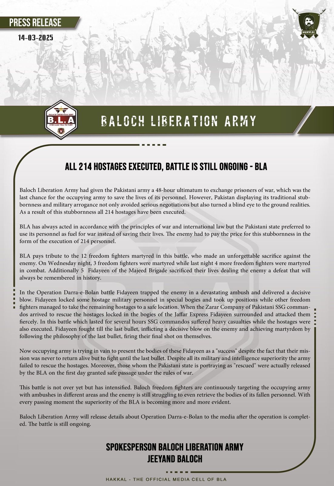 बलुच बंडखोरांनी सांगितले की, आम्ही युद्धकैद्यांच्या देवाणघेवाणीसाठी पाकिस्तानी सैन्याला 48 तासांचा अल्टिमेटम दिला होता. जीव वाचवण्याची ही त्यांच्यासाठी शेवटची संधी होती. पण नेहमीप्रमाणे, त्यांनी अहंकार दाखवला. पाकिस्तानने कोणतीही चर्चा झाली नाही. वास्तव माहीत असूनही, त्यांनी याकडे डोळेझाक केली. पाकिस्तानी सैन्य आणि सरकारच्या या हट्टीपणामुळे आम्ही सर्व 214 ओलिसांना मारले आहे, असं बलुच लिबरेशन आर्मीकडून सांगितलं गेलं आहे.
