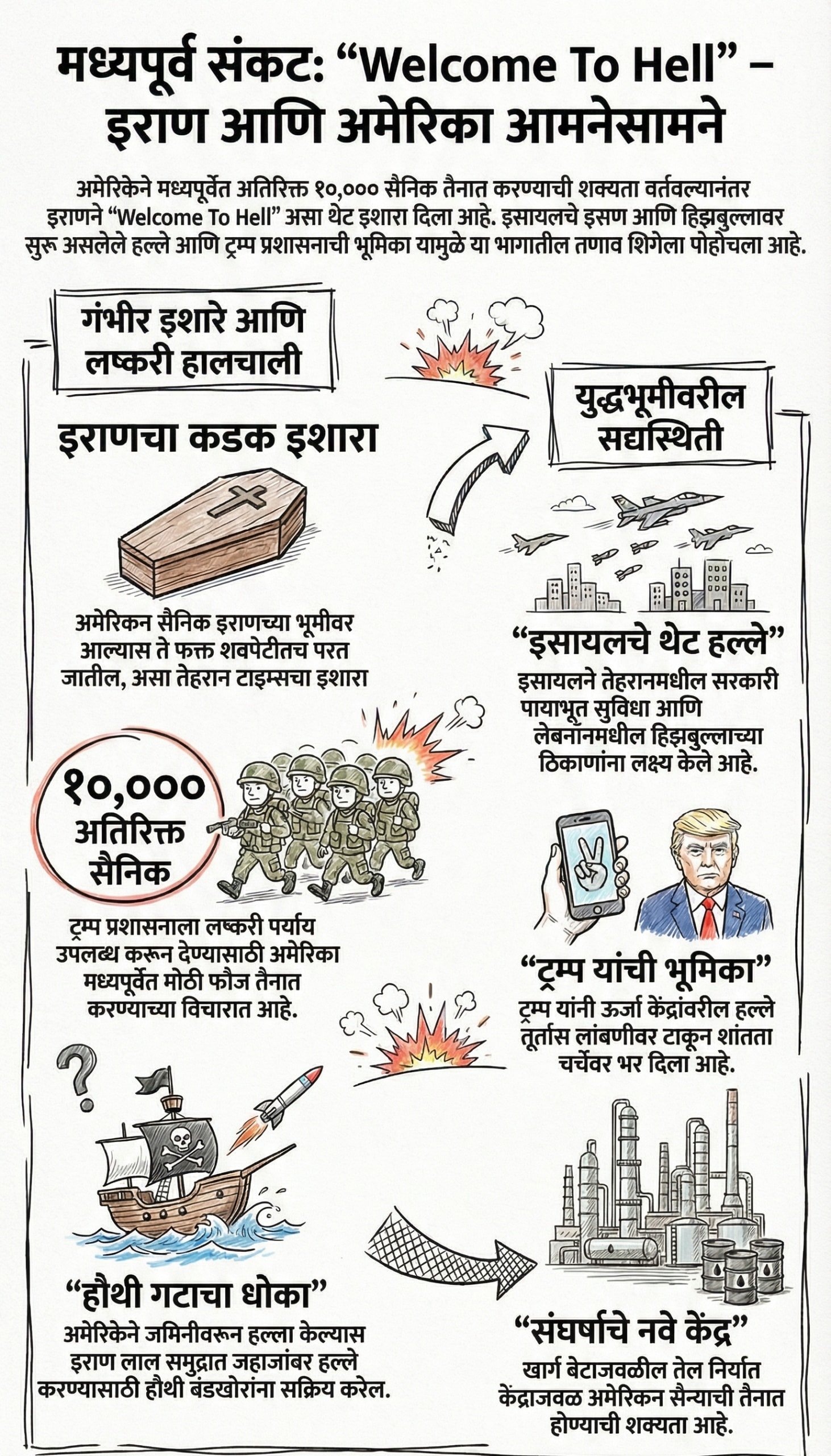 इराणच्या 'तेहरान टाइम्स'ने अमेरिकन सैन्याला "Welcome To Hell" म्हणत थेट निर्वाणीचा इशारा दिला असून, इराणच्या भूमीवर पाऊल ठेवल्यास सैनिक केवळ शवपेटीतच परत जातील, अशी धमकी दिली आहे.
