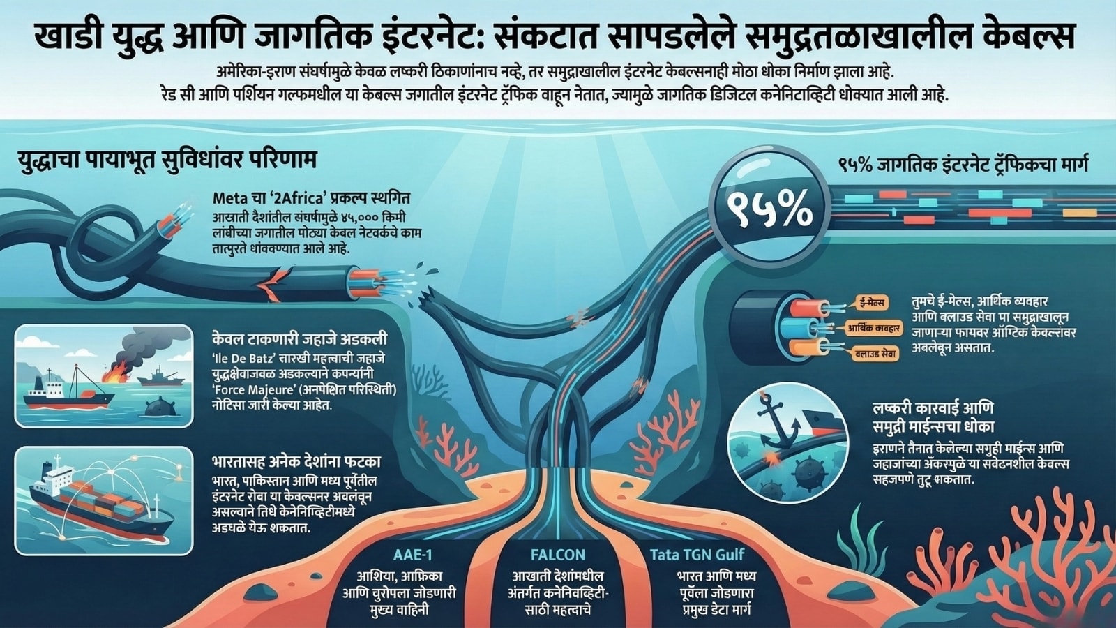 रेड सी आणि पर्शियन गल्फच्या समुद्रतळाखाली शेकडो फायबर ऑप्टिक केबल्स पसरलेल्या आहेत. ज्या जगातील 95% पेक्षा जास्त इंटरनेट ट्रॅफिक वाहून नेतात. याचा अर्थ तुमचे ई-मेल्स, व्हिडिओ कॉल्स, क्लाउड सेवा, आर्थिक व्यवहार आणि स्ट्रीमिंग सर्व काही या केबल्सवर अवलंबून आहे.