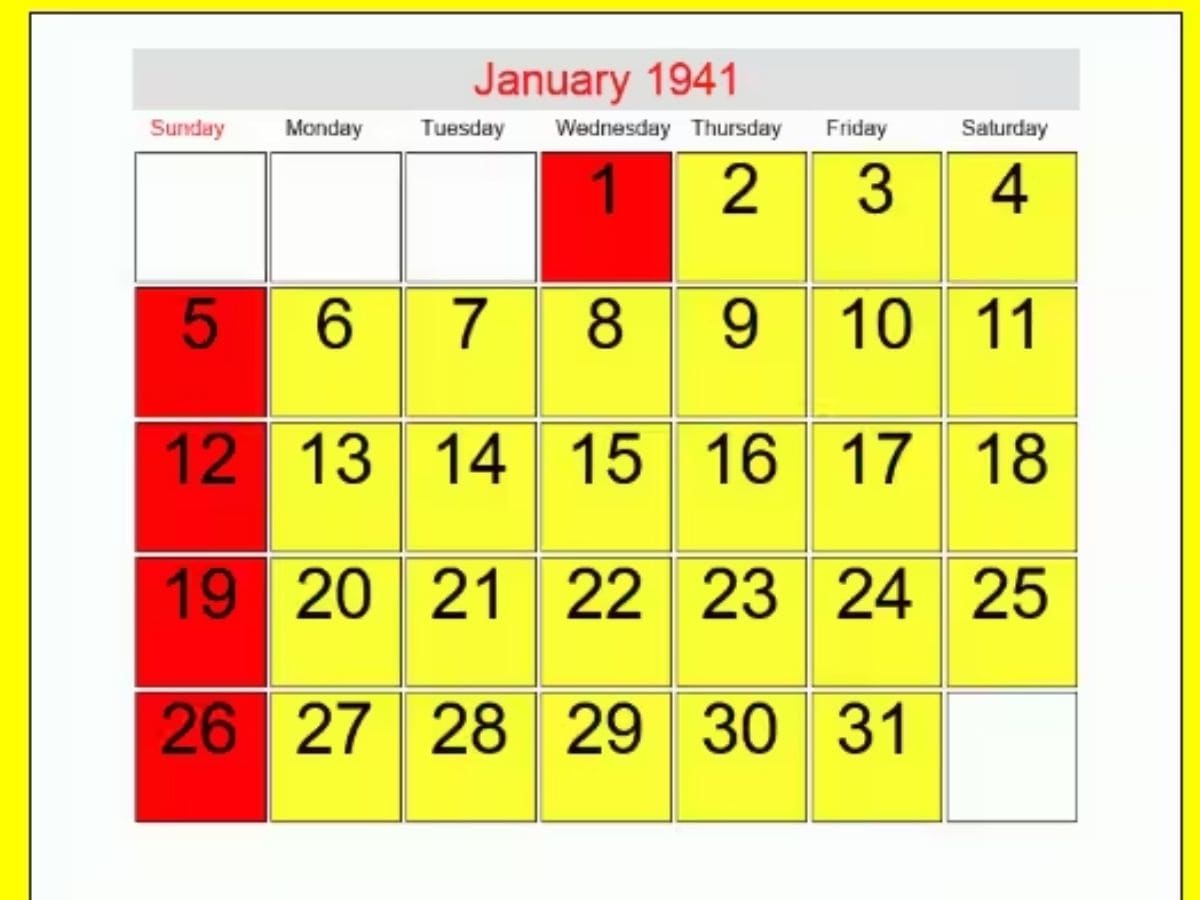 1941 आणि 2025 चं कॅलेंडर एकसारखं आहे. अगदी त्याच तारखा आणि तोच दिवस. खाली आम्ही या दोन वर्षांचे कॅलेंडर देत आहोत. म्हणून जर तुम्ही 1941 च्या कॅलेंडरकडे पाहिलं तर 2025 च्या कॅलेंडर सारखंच दिसेल ते पाहून तुम्हाला आश्चर्य वाटेल. 1941 आणि 2024 ही दोन्ही लीप वर्षे नाहीत. दोन्हीमध्ये 1 जानेवारी बुधवारी येतो.