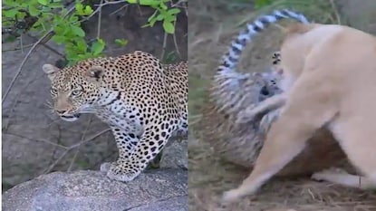 सिंहिण अचानक कुठूनतरी समोर आली आणि बिबट्याशी भिडली, शक्ती कमी असतानाही मादी बिबट्या मागे हटली नाही. ती आपल्या पिलांना वाचवण्यासाठी सिंहिणीशी निकराने लढली आणि नंतर तिचे लक्ष भरकटवून तिला दुसरीकडे घेऊन गेली, जेणेकरून तिची पिले सुरक्षित राहतील.