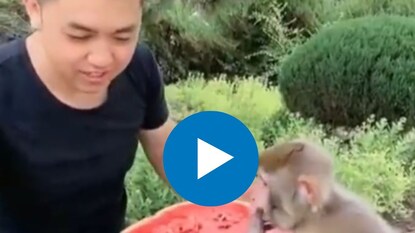 VIDEO : व्यक्तीनं माकडाबरोबर खाल्लं कलिंगड; क्युट व्हिडीओनं जिंकलं मन