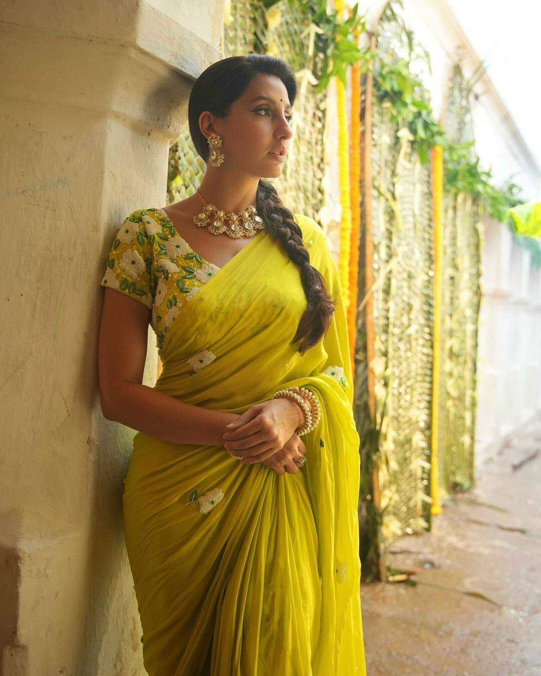 लिंबू कलरच्या साडीतील नोराचा पारंपारिक अंदाज चाहत्यांच्या पसंतीस उतरत आहे.
